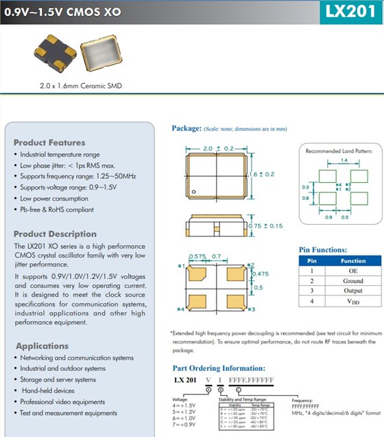 百利通亚陶晶振LX201 XO系列是具有极低抖动性能的高性能CMOS晶体振荡器系列,LX201系列,0.9V~1.5V、超小型尺寸2.0x1.6mm、低电源电压CMOS晶体振荡器,它支持0.9V/1.0V/1.2V/1.5V电压并且消耗非常低的工作电流。它旨在满足通信系统、工业应用和其他高性能设备的时钟源规范。